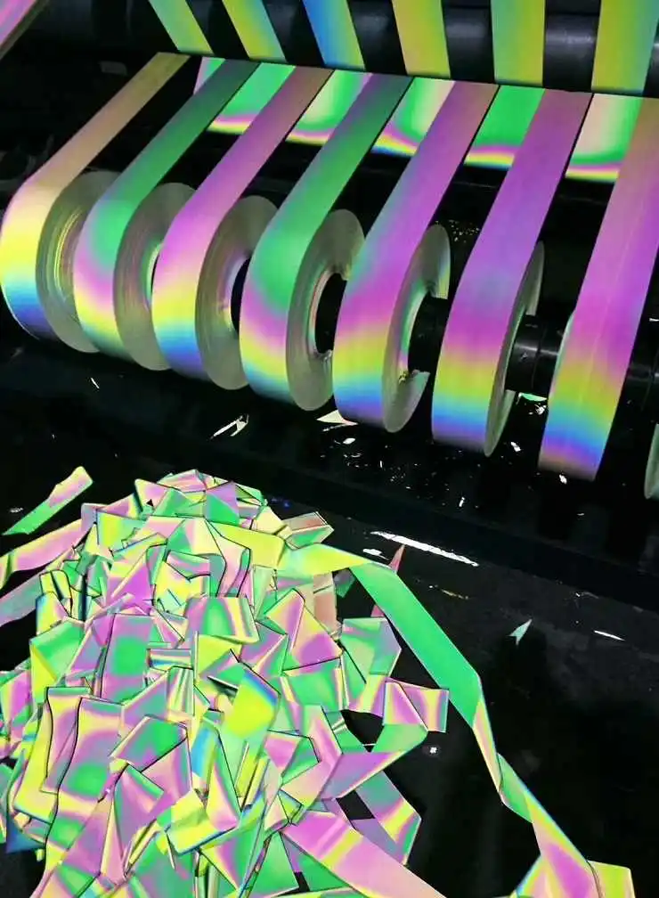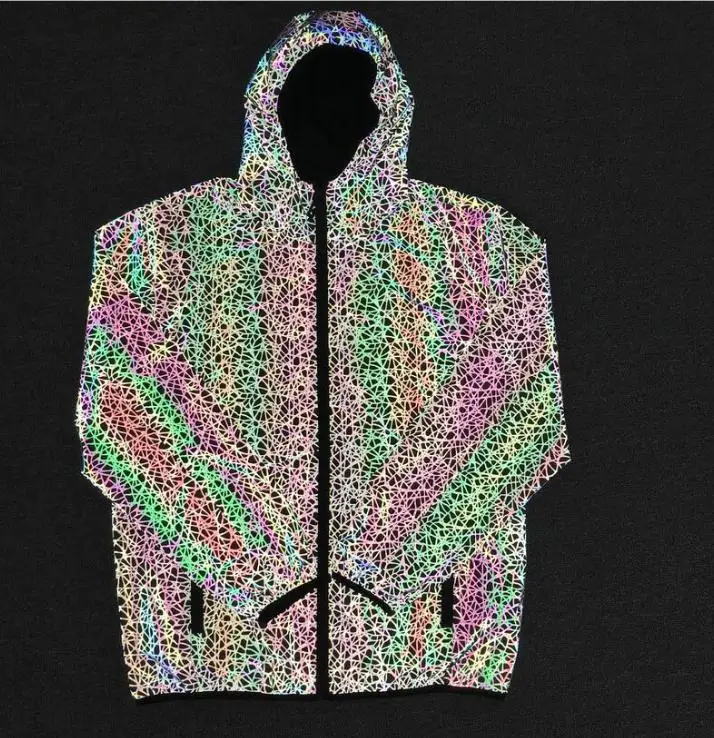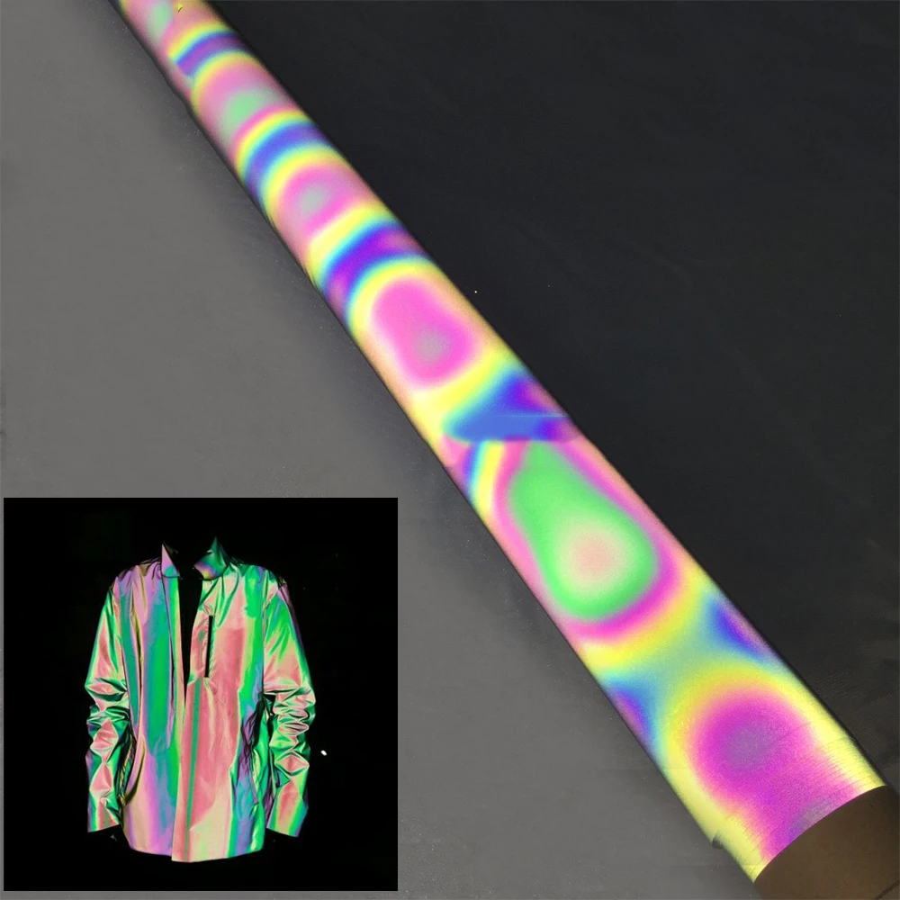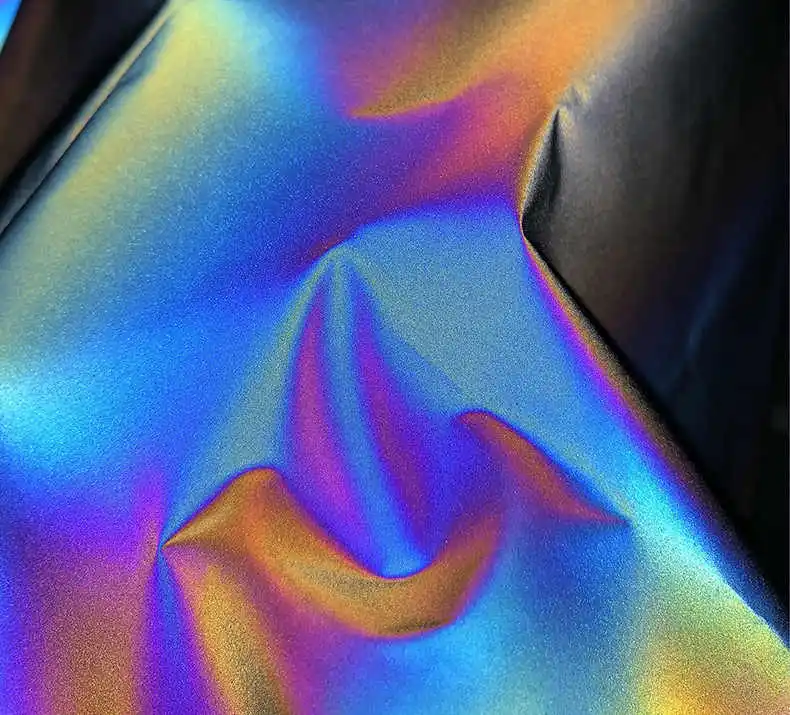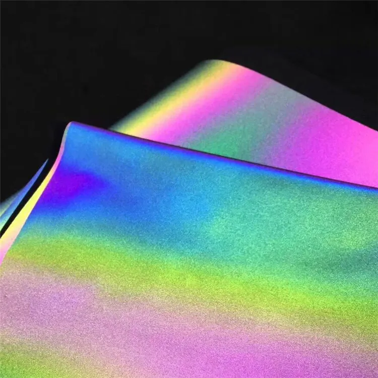 Product name:Rainbow Reflective Fashion FabricWidth:1M3 or customizedWashing fastness:>25 sykliä Sovellus: Kaikenlaiset vaatteetOminaisuus:Erittäin heijastavaLogo:Muokattu logoNäyte:Muodettu Väri:Sateenkaari